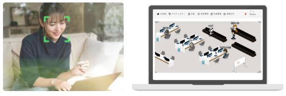 パソコンの前に座っているだけで、目線や動作で画面に向かっているかを自動判別。その状況を仮想オフィスに見立てたクォータービューで、あなたに代わってアバターが表示。