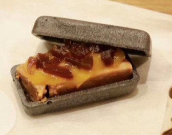 柔らかく蒸した天然うなぎにおかきをまぶして揚げ、鰻のタレをかける。さらに、ブルーベリーの醤油ソースとパッションフルーツ、木の芽も挟んだバーガー。
