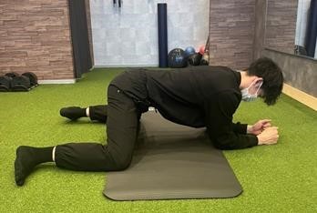 2)肩の下に肘を置き、身体全体を前後に細かく揺らす。