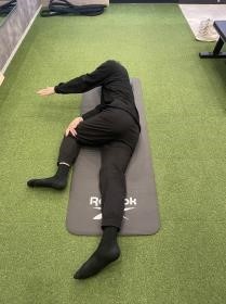 1)横向きに寝た状態から、上の足を前に出し、下の手で膝を押さえる。