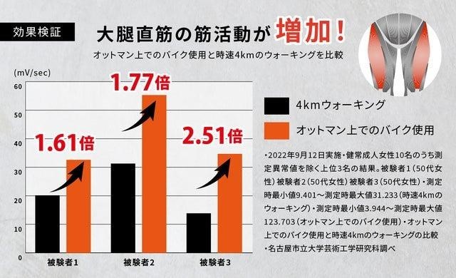 サイクル運動器具は、装備が大きく組み立てる手間もかかり、部屋のスペースが占領される。「オットマンバイク」が必要なスペースは、わずか約 46 ㎝平方の省スペース。日本の住環境に合わせてインテリアとしても使用でき、4km のウォーキングと比較しても運動効果が高いことが確認できている。