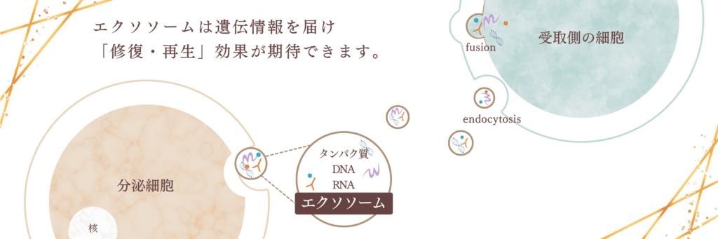 「エクソソーム」とは細胞間の情報伝達に使われる顆粒状の物質で、修復の指示を出す。老化や損傷を受けた細胞や組織に幹細胞が集まっていく「ホーミング効果」を持っており、効率よく細胞の再生や修復を促す。
