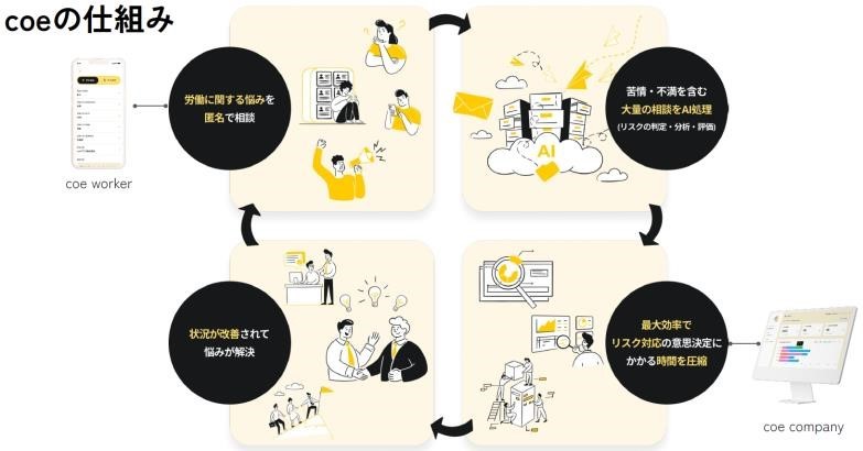 coe(コエ)は、働く上での問題や気になったことを相談、周りの人が辛い状況にあることを企業