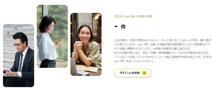 状況が改善されて欲しいという思いからcoe に届いた相談件数を HP に表示。自分の会社、気になる企業に相談が届いているか検索することもできる