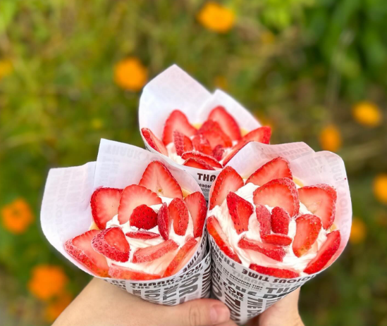 自社製オリジナルのクレープは、品出しした途端に売り切れるほど人気となっている。「幸せを呼ぶブーケ」はスライスしたいちごがバラの花びらのようにクレープの上にぐるりと飾られ、名前の通り花束のようで映えると女性に人気。映えスイーツとして松坂屋の催事で行列ができ、1000 個以上売れた。