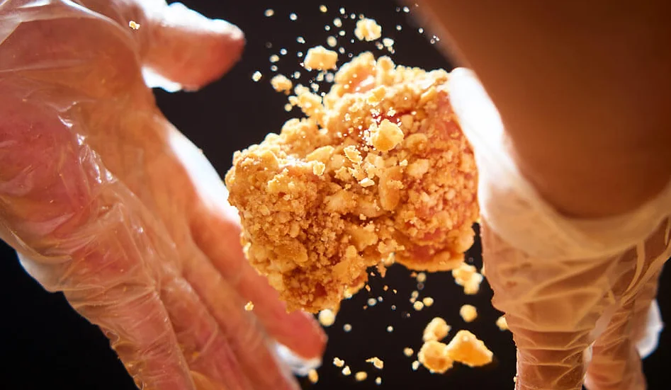 唐揚げ発祥の中国での出店経験の経験後、国内の全国の醤油蔵に通い、3年がかりで専用のたれを開発。醤油麹を多く含んだたれは、つけ込んだ鶏肉の熟成が進み、うまみとジューシーさが増す。出来たてはもちろん、冷めても良い食感が続き長く置くことで濡れ煎食感になる。