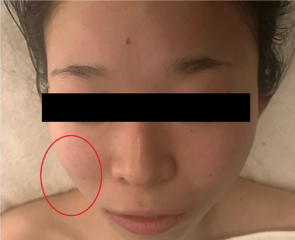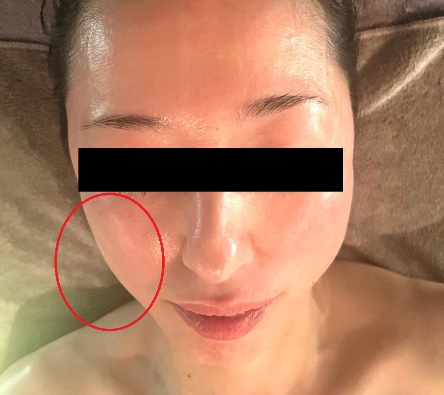 顔の右半分(写真向かって左側)だけを1分間施術。スッキリと持ち上がっている。