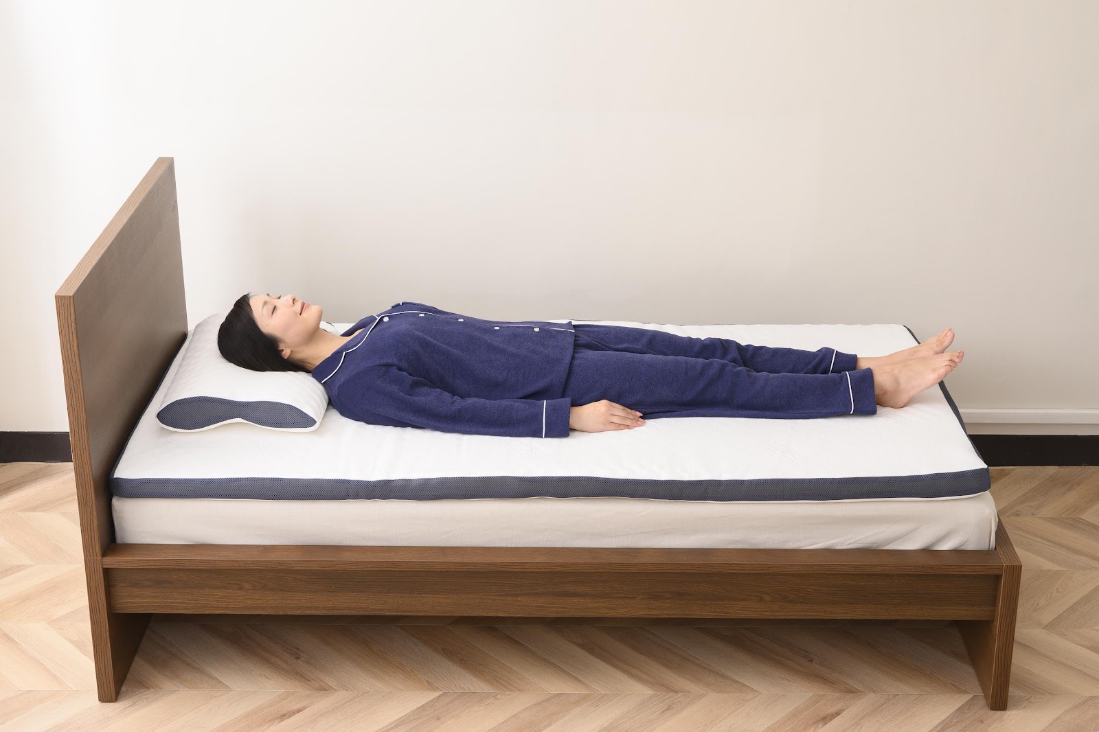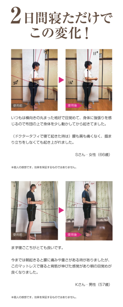 【特殊な凸凹の形状で体圧を分散し、理想的な寝姿勢を実現】使用後は姿勢も変化し、腰痛の改善も期待できる