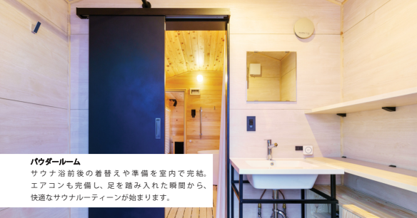 木造トレーラーハウスは多いが、シャワーブース・浴槽・脱衣所の一体型は非常に珍しい。トレーラーハウス車台に脱衣室・サウナ室・水風呂・ととのいエリアを完備している。