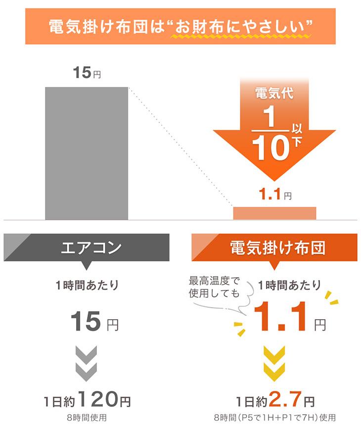 【エアコンと比べてみても電気代の差は歴然…】電気掛け布団であれば1時間あたり1.1円なので節電にも効果的!
