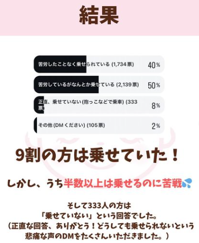 乳幼児育児アドバイザーの和氣春花氏が4,000人以上のママに行ったアンケートによると、チャイルドシートに乗せるのに苦労していると答えたママは、50%に及んだ。