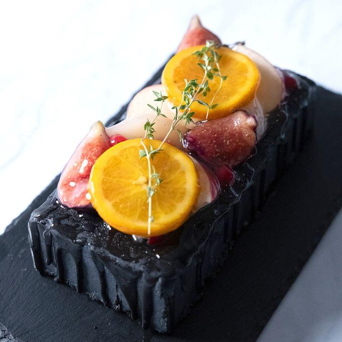 厳選した季節の味覚の、りんご、オレンジ、洋ナシ、黒いイチジクで、栽培が非常に難しく収穫量が少ないことから「黒いダイヤ」とも呼ばれる「ビオレ・ソリエス」をたっぷりと乗せ、チョコレートを垂らし、見ているだけで食欲を刺激するような宝石のような仕上げにしている。