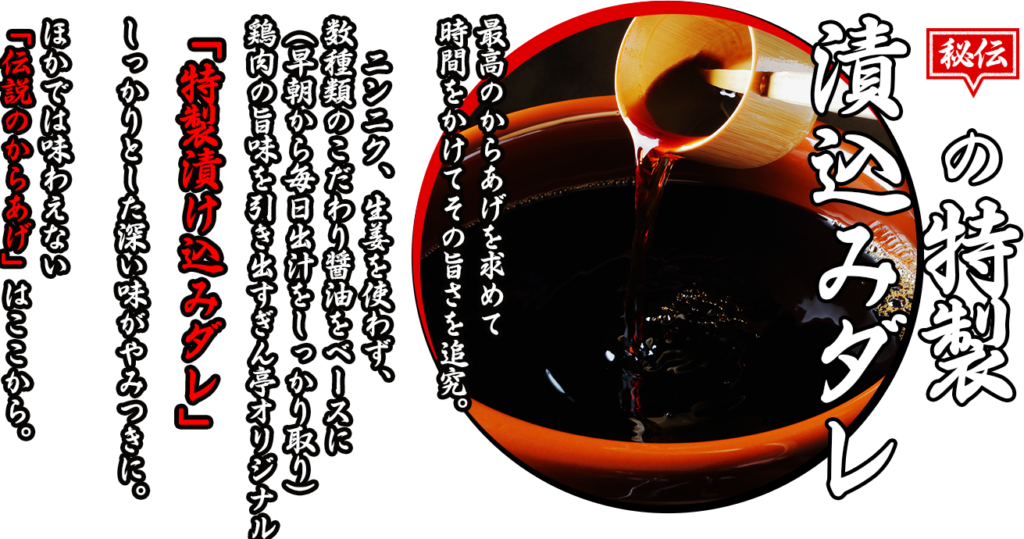 最高のからあげを求めて、時間をかけてその旨さを追求!ニンニク、生姜を使わず、数種類のこだわり醤油をベースに(早朝から毎日出汁をしっかり取り)鶏肉の旨味を引き出す、ぎん亭オリジナルの秘伝「特製漬け込みダレ」を開発。