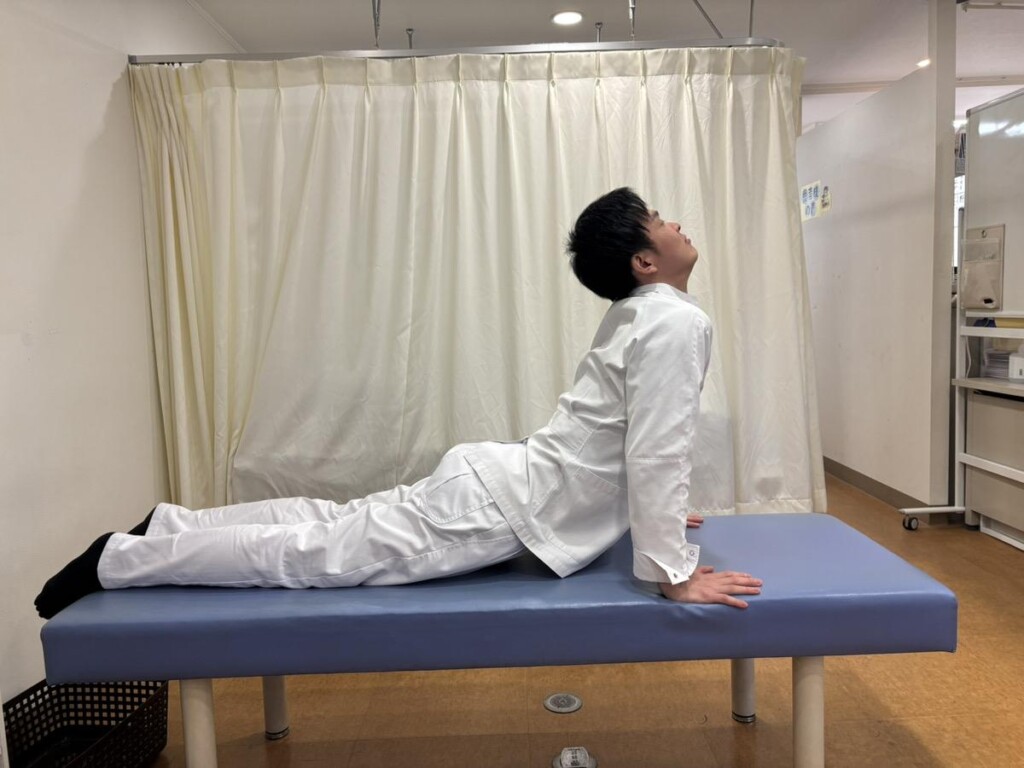 | 1. うつ伏せの状態になり、足は肩幅程度に開いておく。 2. 肩の真下に手を置き、手のひらで床を押しながら上半身を起こす。 3. 胸を張った状態で呼吸を繰り返し、お腹前面の伸びを感じながら30秒ほどキープする。 4. 息を吐きながら上半身を床方向に戻す。 5. 2~4を3セット繰り返す。 |