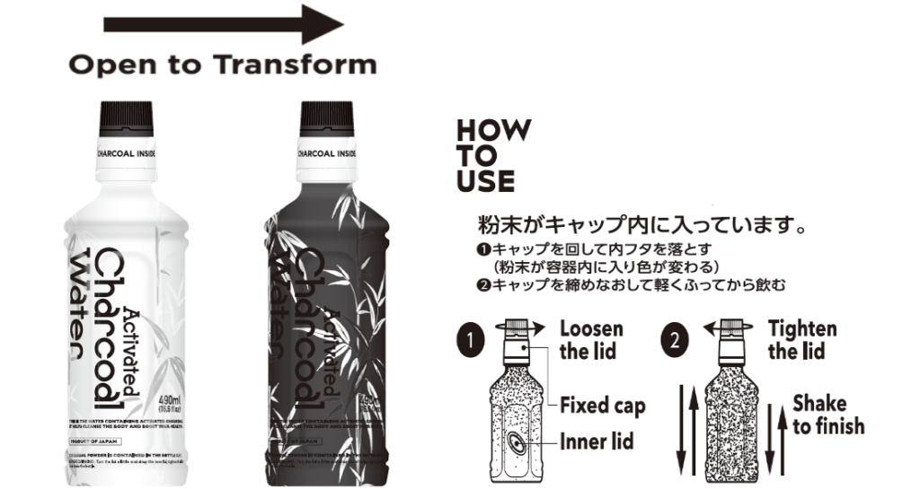 国内特許技術を使用したキャップを開けると、キャップ内の竹炭&ヤシ殻活性炭の粉末により水が黒色へ変化し、いつでもどこでも手軽に活性炭入りの水が完成する。