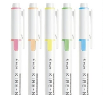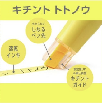 ペン先のチップ両端に付けられたガイド「キチントガイド」が紙面に当たることで筆記が安定しまっすぐな線を引きやすくなっている画期的な蛍光ペン。
