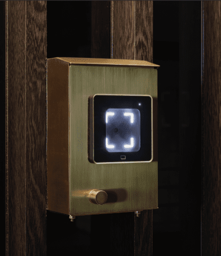 中を開けると真鍮ボタンが出現。ボタンを押すと中からタキシードの男性スタッフ、スーツの女性スタッフが出迎えてくれる。