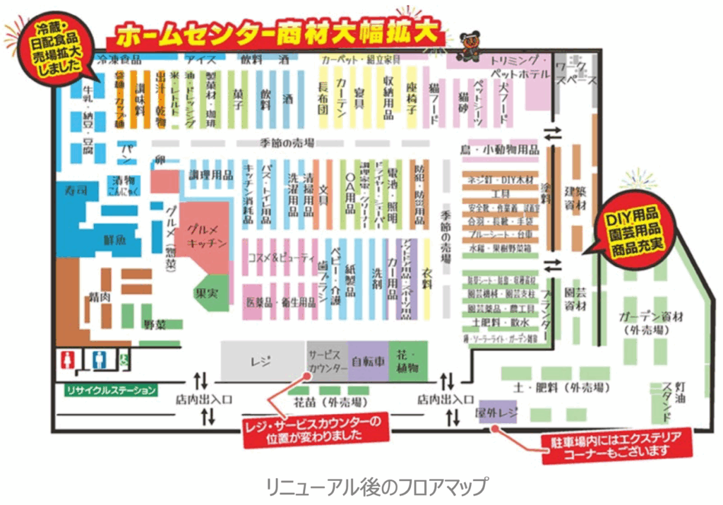 今回の改装では、園芸・DIY コーナーを大幅に拡大し、日配品もお客さまからご好評いただいている人気商品を多数取揃えました。これにより、より一層便利で快適なお買い物環境をご提供いたします。