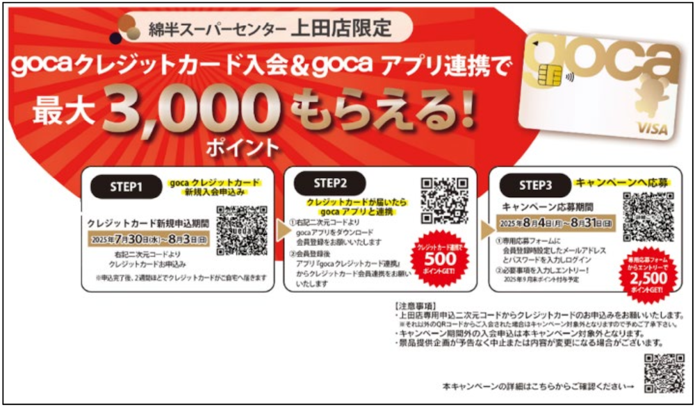 goca クレジットカード入会&goca アプリ連携で、最大 3,000 ポイントもらえるキャンペーンを実施します。