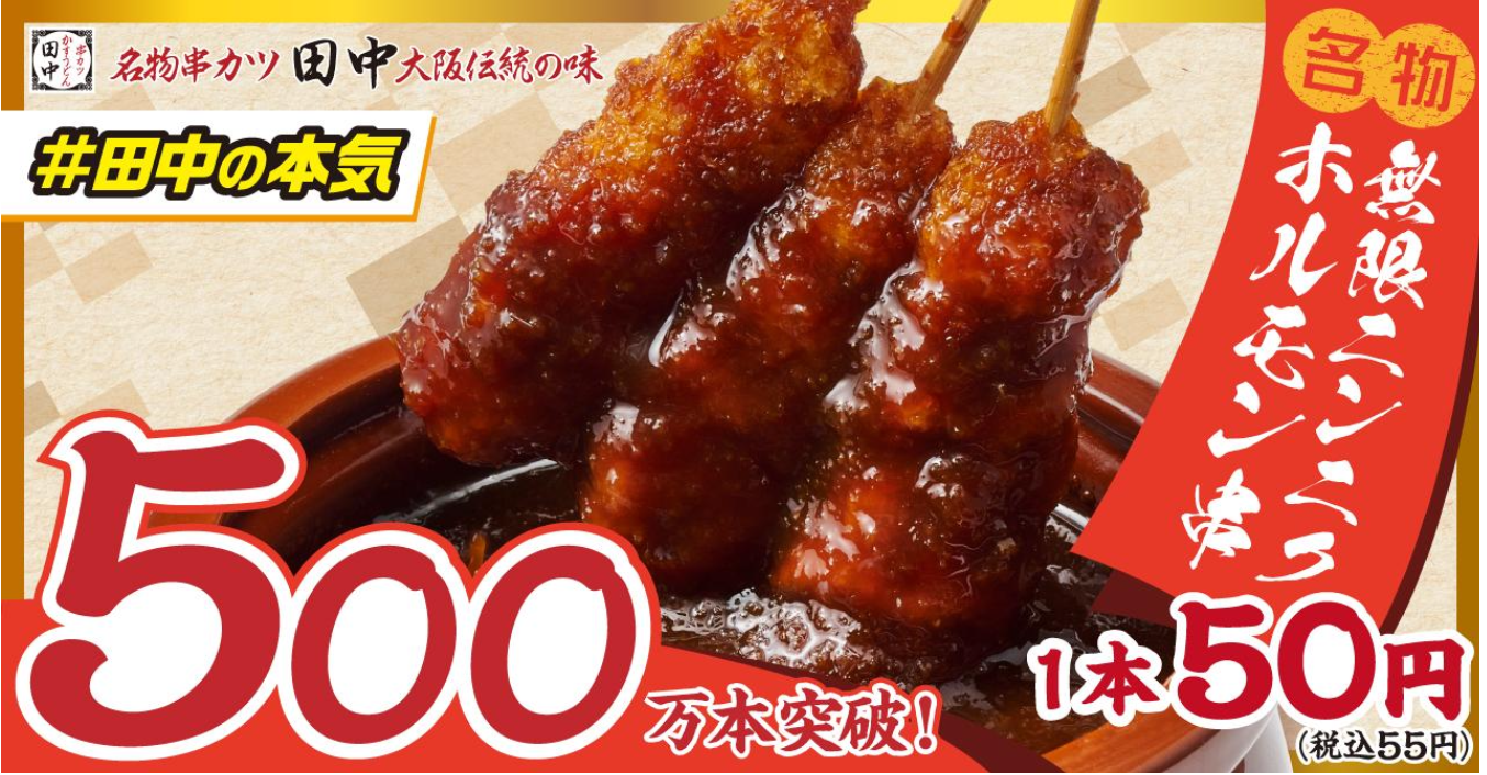 串カツ田中が2025年4月24日(木)から販売している、1本50円(税込55円)の新名物「無限ニンニクホルモン串」が、販売開始から約3ヶ月で累計販売数500万本を突破しました!