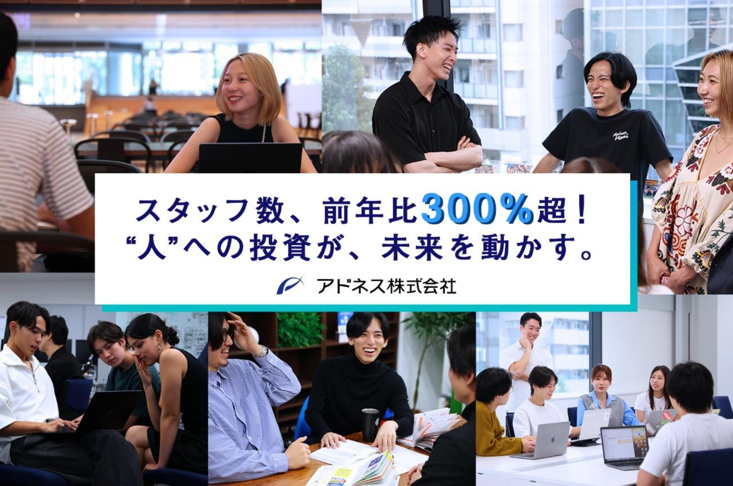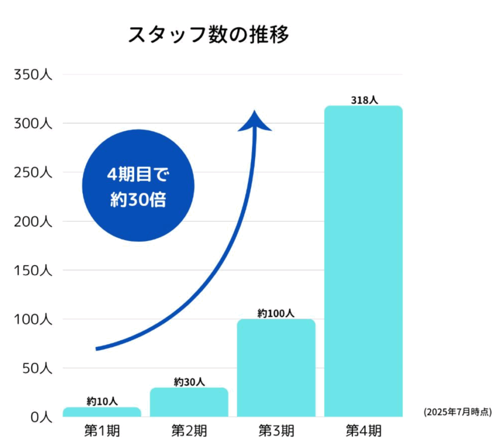 Web マーケティングや SNS・広告運用、生成 AI、セールス、デザインなど、実践的なスキルを効率よく習得できる次世代型のオンライン教育プログラム「スキルプラス」を提供するアドネス株式会社は、2025 年 7 月より第5期目の事業年度を迎えました。第 3 期に約 100 名だったスタッフ数は、第 4 期には 318 名へと約 3 倍に拡大。過去最多となる 200 名超の採用を実現し、人員体制のスケールアップを果たしました。さらに、第 5 期初月となる 2025 年 7 月には、すでに〇名の新メンバーが加わり、勢いそのままに事業と組織の拡大を続けています。