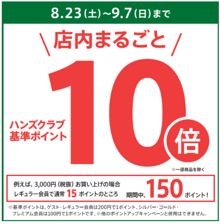 9 月 7 日(日)まで、店内まるごと※1ハンズクラブ基準ポイント※2 が通常の 10 倍貯まります※3!