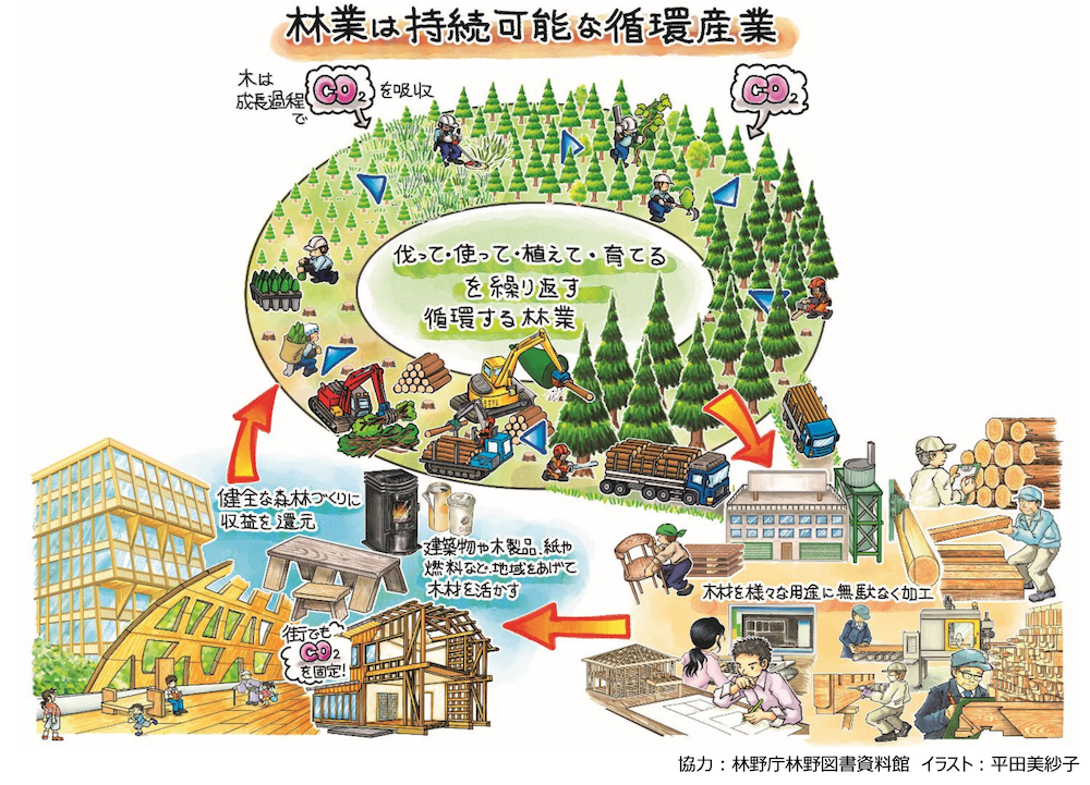 綿半建材は、「100 年先の森林を考えて」、従来のやり方に捕らわれず、次の世代に健全な森を引継ぐことを目的に、ReFI(Re Forest Innovation)プロジェクト を発足しており、「伐る・使う・植える・育てる」という、森を守り続けるための持続可能なサイクルを柱として、森林整備に関する取組みを進めています。