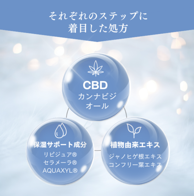 CBDボディクリーム モイスチャーインテンスは、それぞれのステップに着目した成分を配合した商品です。1000mgのCBD(カンナビジオール)を中心に、リピジュア®・セラメーラ®・AQUAXYL®などの注目の保湿サポート成分を配合。また、植物由来のジャノヒゲ根エキスやコンフリー葉エキスが、乾燥による肌の不調を防ぎすこやかな肌環境を保ちます。