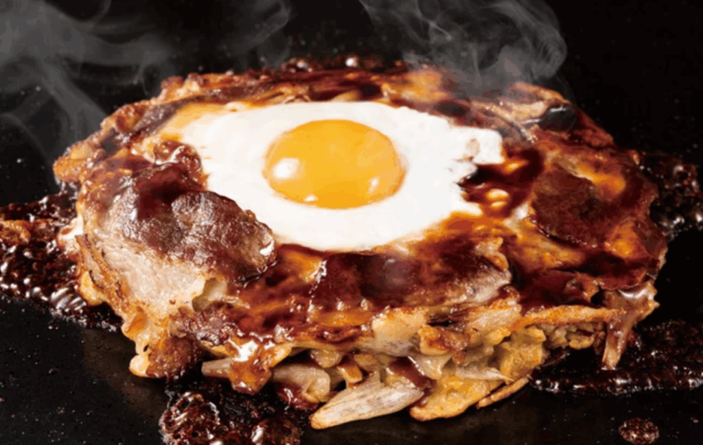 牛すじ×ごぼうの旨みを半熟たまごと甘め和風タレでとじた「お月見お好み焼き」