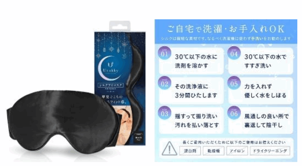 最高級の 100%シルクを使用した、極めて軽量で柔らかな肌触りのアイマスク。