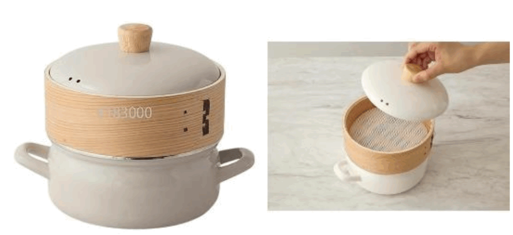竹製せいろがセットになったホーロー鍋。食材のこびり付きを防ぐシリコーンメッシュシートが付属しています。