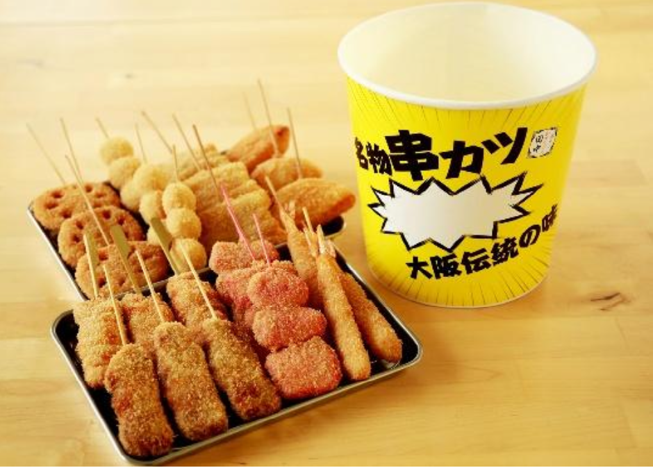 串カツ牛、串カツ豚、玉ネギ、レンコン、エビ、うずら、紅しょうが、アスパラといった人気 8 種串カツがバケツのような容器に入った商品です。