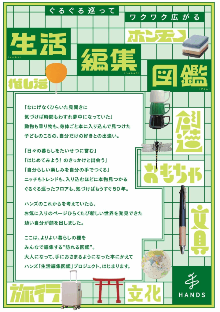2026 年の創業 50 周年に向けさまざまなキャンペーンやイベントを計画していますが、その一環としてハンズ渋谷店では 2025 年 9 月より「生活編集図鑑」プロジェクトを始動、渋谷店を実際に見て触って楽しめる“図鑑”としてリブランディングいたします。