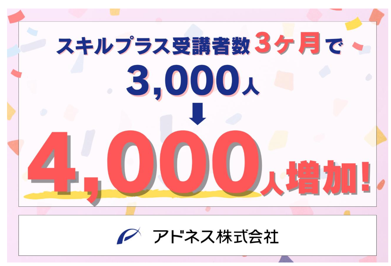 生成 AI イノベーションのグローバルリーダー、アドネス株式会社(本社:東京都新宿区四谷、代表取締役社長:三上功太)は、マーケティングや SNS・広告運用、生成 AI、セールス、デザインなど、実践的なスキルを効率よく習得できる社会人のためのスキル習得プログラム「スキルプラス」の累計受講者数が、2025 年 9 月時点で 4,000 人を突破したことをお知らせいたします。