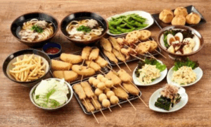 ■串カツ(8 種) 串カツ牛、串カツ豚、レンコン、玉ネギ、エビ、紅しょうが、アスパラ、チーズ ■サイドメニュー キャベツ、枝豆、梅きゅうり、ポテトサラダ、牛すじ土手、かすうどん、ポテトフライ、さいぼし、 自分でつくるたこ焼き ■デザート ミニデザート |
