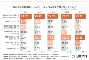 車の自動運転機能の認知度について、「よく知っている」と答えた方は約1割にとどまり、「ある程度知っている」や「少しだけ知っている」が多数を占めました。自動運転機能に対する印象は、20代は「未来的でワクワクする」という回答が2位となり、新技術に対する期待の高さがうかがえました。