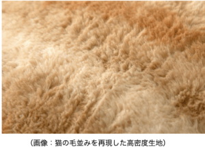 本製品は暖かさだけでなく、まるで本物の猫のような質感と触り心地にもこだわっています。一般的なマイクロファイバー製品は生地密度が180g/㎡程度ですが、本製品は340g/㎡と約1.8倍の高密度生地で空気をたっぷり含むことで滑らかで温かい触り心地を実現しています。さらに、縮れた繊維を直毛にする「ポリッシャー加工」においても加工のタイミングで回数を細かく調整することで本物の毛並みに近い質感を再現しています。