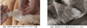 また、カバーとして使用する際はスナップボタンで掛布団と固定することができ、取り付けも簡単になっており、使用する中で掛布団とカバーがずれてしまった場合も簡単に直すことができるように角に2か所スリットを設けています。